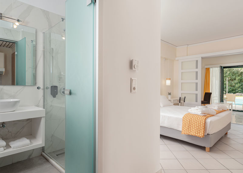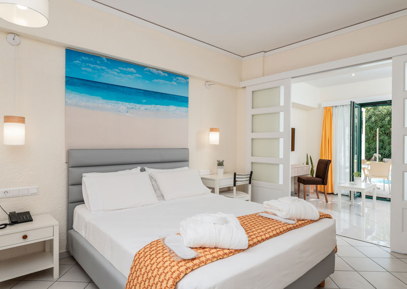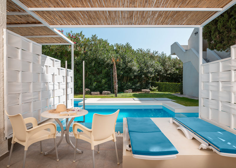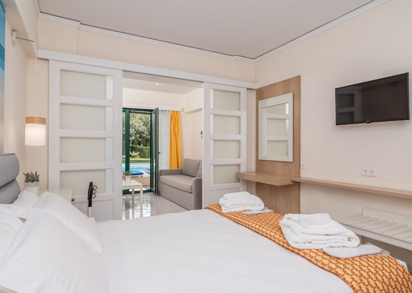 The Swim ups are an ideal choice for up to three people, featuring a bedroom, a stylish living room with a sofa bed, a kitchenette and a modern tiled bathroom. This extraordinary room is complete with a terrace and direct access to a swimming pool perfectly equipped with all the details that will transform your stay into a magical one! Our Swim ups can accommodate up to 3 persons (adults only).